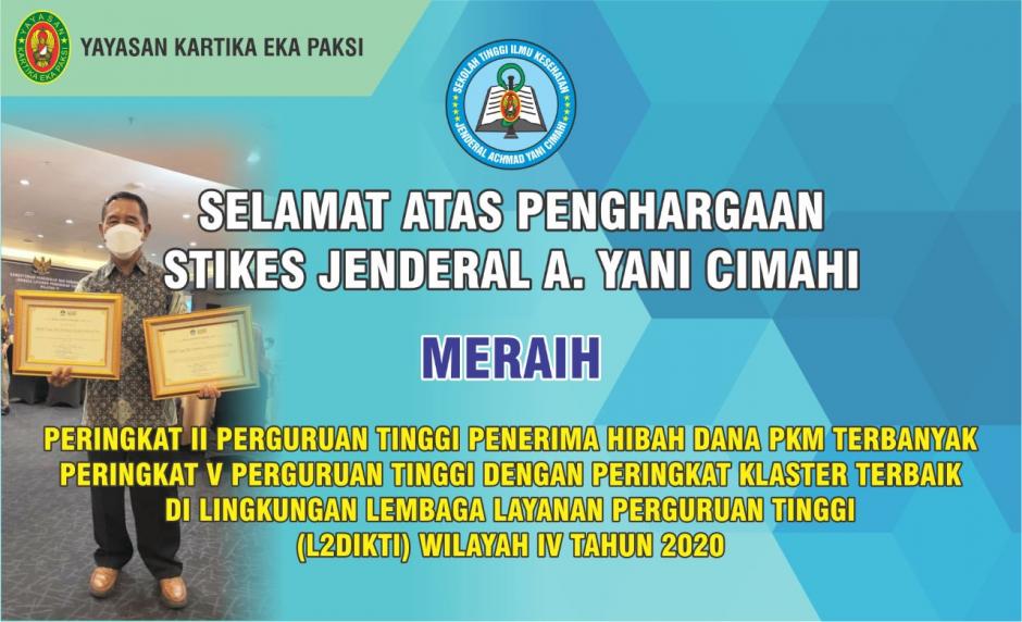 Stikes Jenderal A. Yani Cimahi menerima sekaligus menerima dua penghargaan dari LLDIKTI pada acara Anugerah LLDIKTI Wilayah IV tahun 2021.Stikes Jenderal A. Yani Cimahi menerima Penghargaan Peringkat II sebagai Perguruan Tinggi penerima hibah PKM dengan Judul terbanyak dan Peringkat V[...]