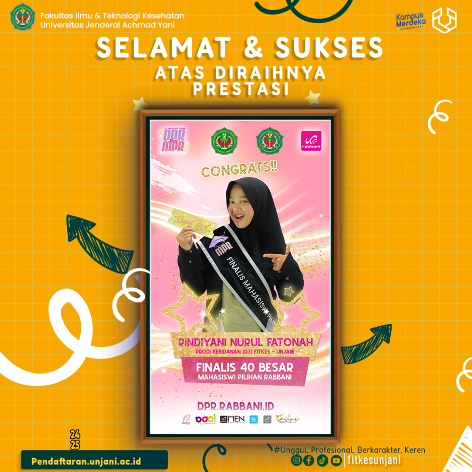 Selamat & Sukses.Mahasiswa Program Studi Kebidanan (D3) FITKes Unjani Atas nama Rindiyani Nurul Fatonah. Finalis 40 Besar Mahasisiwi Pilihan Rabbani..Selamat atas capaian prestasinya semoga menjadi inspirasi dan motivasi teman-teman lainnya. Salam Prestasi. [...]