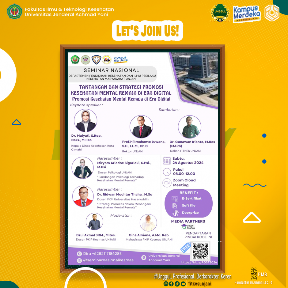 Mahasiswa Kesehatan MasyarakatFITKES Universitas Jenderal Achmad Yani Proudly PresentSEMINAR NASIONAL DIGITAL HEALTHTANTANGAN DAN STRATEGI PROMOSI KESEHATAN MENTAL REMAJA DI ERA DIGITAL" PROMOSI KESEHATAN MENTAL REMAJA DI ERA DIGITAL " Sabtu, 24 Agustus 2024 08.00 - 12.00 WIBOnline via zoom meetingGRATISUntuk[...]