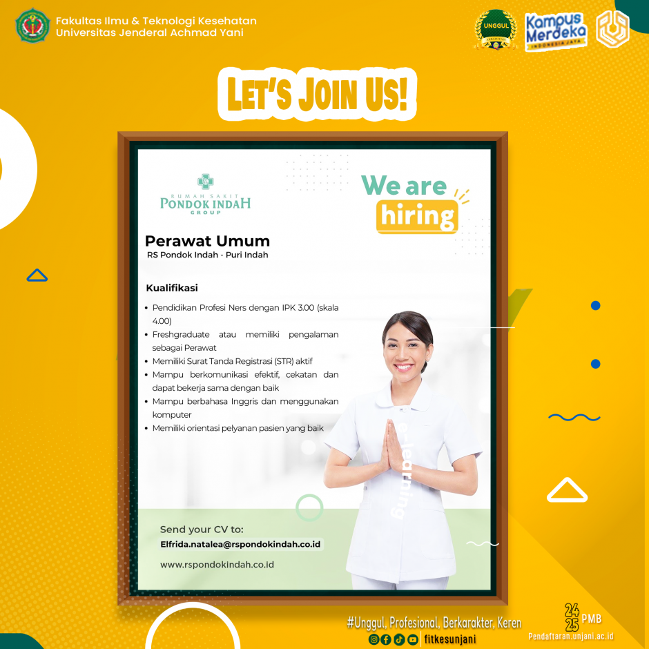 We Are Hiring.Perawat UmumRS Pondok Indah-Puri Indah.Kualifikasi- Pendidikan Profesi Ners dengan IPK 3.00 (Skala 4.00)- Freshgraduate Atau memiliki pengalaman sebagai Perawat- Memiliki Surat Tanda Registrasi (STR aktif)..Send your CV to ke alamat yang tertera di poster..Selamat mencoba & semoga lolos.[...]