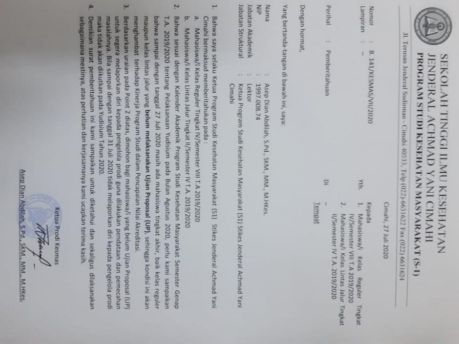 KEPADA SELURUH MAHASISWA S1 ILMU KEPERAWATAN STIKES JENDERAL ACHMAD YANI CIMAHI Assalamualaykum wr wb kami dari unit penjamin mutu ilmu keperawatan stikes jenderal achmad yani, membuat eval[...]