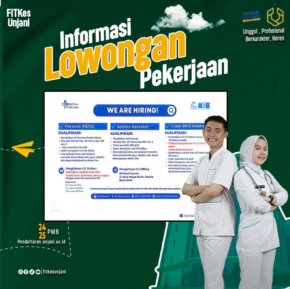 Hai Healthies, kami mengajak Anda para talenta muda, penuh motivasi dan semangat untuk bergabung dengan RS Royal Taruma dan jadilah bagian dari keluarga besar RS Royal Taruma , Mari segera daftarkan diri anda.