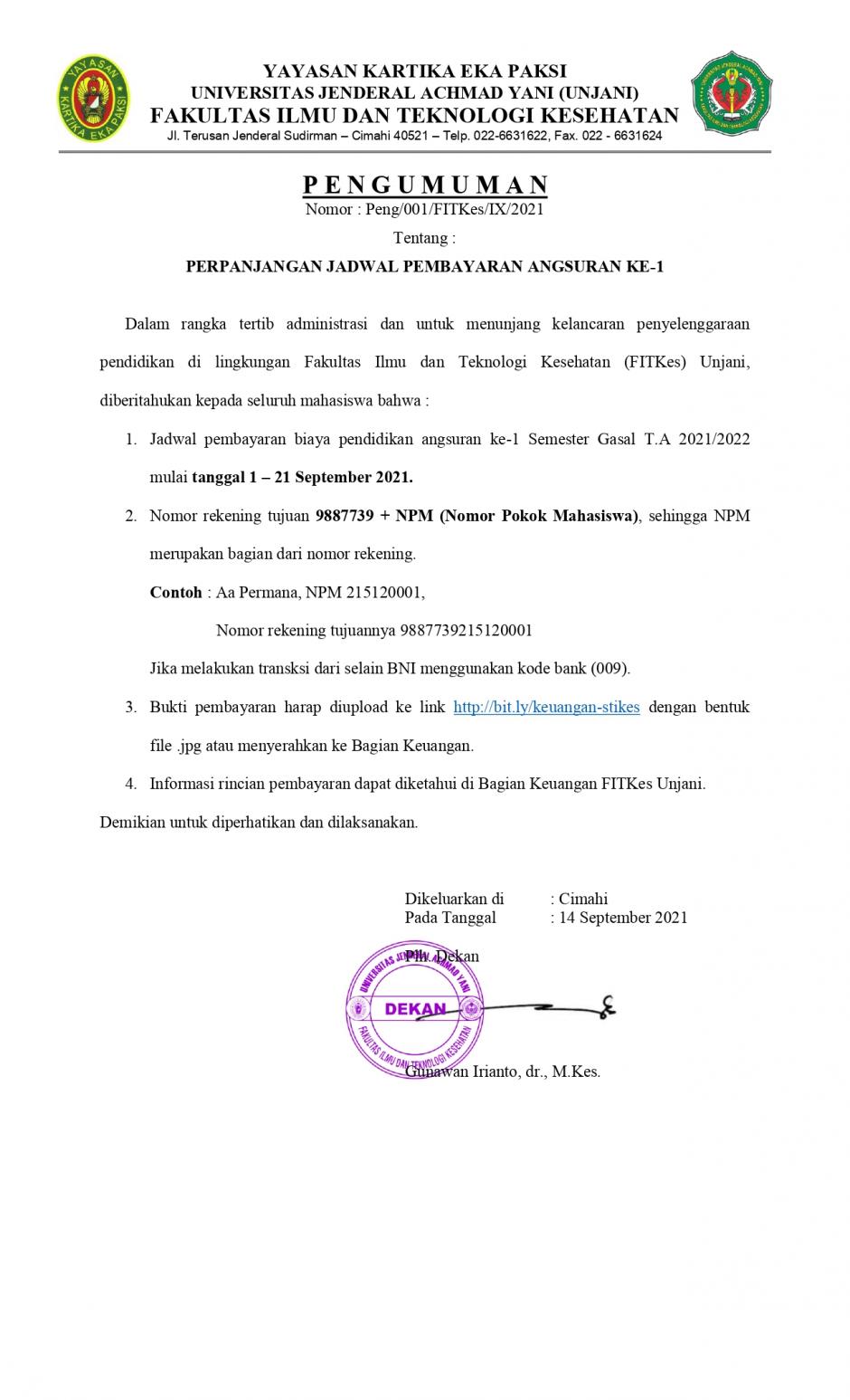 Perpanjangan Jadwal Pembayaran Angsuran ke-1 Semester Gasal T.A. 2021/2022, bisa dilihat dan didownload.